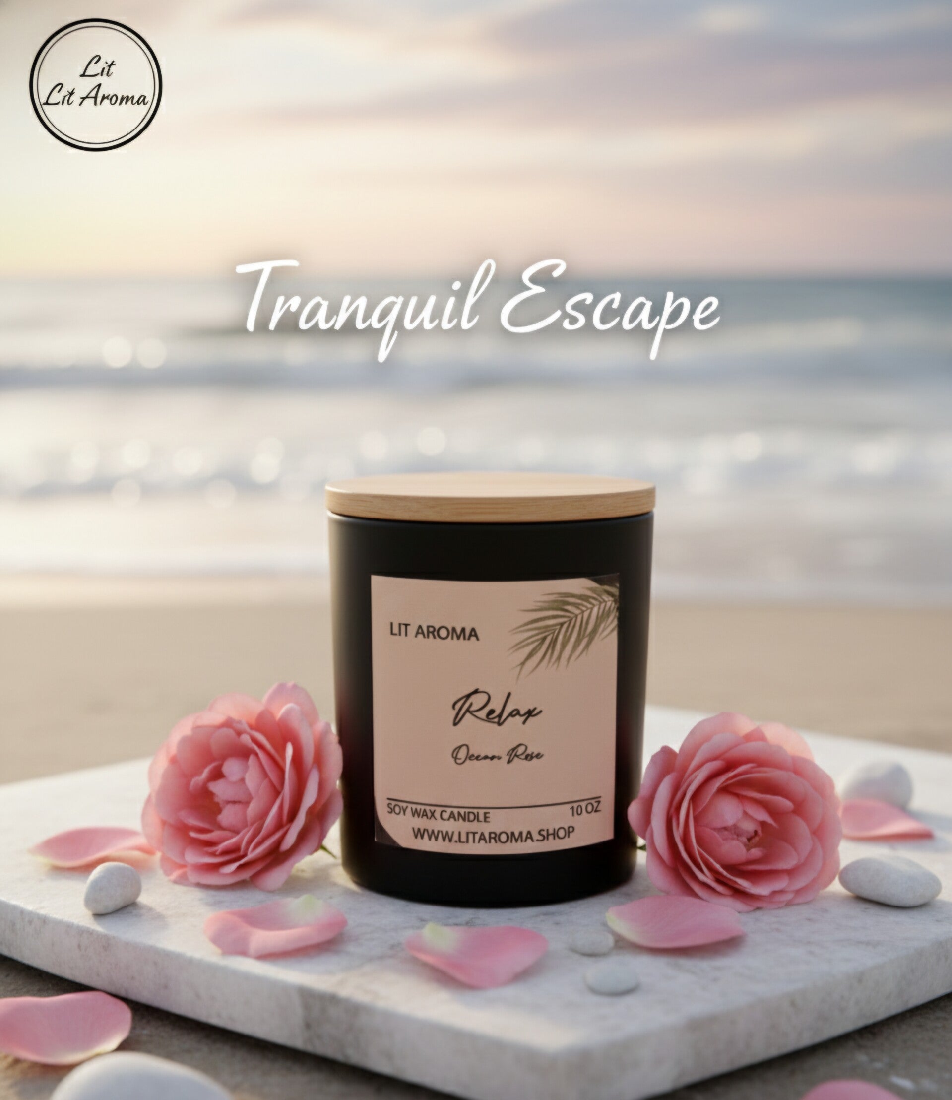 "Unwind with the refreshing and tranquil fragrance of the Lit Aroma Relax Candle in Ocean Rose. Made with natural ingredients, this candle blends the soothing notes of ocean breeze with the delicate scent of rose, creating a serene and calming atmosphere. Perfect for relaxation after a busy day or setting a peaceful mood at home. Embrace relaxation with Lit Aroma – where every scent brings you serenity."